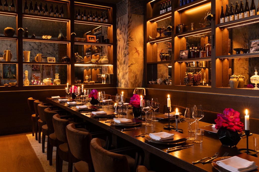 Designed by Block Plan Studios, the 91-seat dining room evokes the spirit of a timeless British guild hall enriched with exquisite verde marble, masterfully finished wood paneling, and rich textures that are equally luxurious and modern. The effect? An understated opulence that feels like it has been tucked away on Mercer Street for decades. Warm tones of mustard, golden amber and pine green decorate the space while whimsical art animates the wood walls.